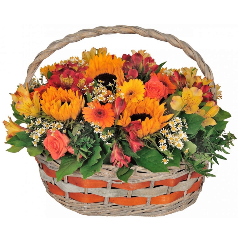 Букет состоит из 5 подсолнухов, 5 роз, 8 веток альстромерии, 7 гербер, 6 веток танацетума, зелень, корзина, оазис.