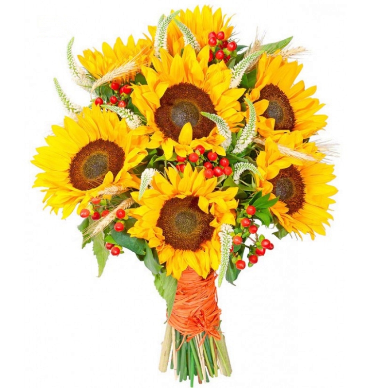 Букет состоит из 9 подсолнухов, 10 веток гиперикума, 12 вероника белая, колосья, зелень, прозрачная упаковка, атласная лента.