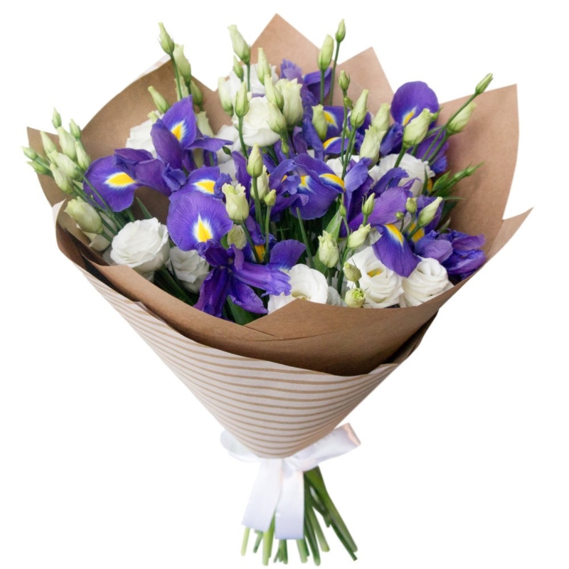 Букет состоит из 5 веток эустомы, 9 ирисов, крафт, атласная лента.