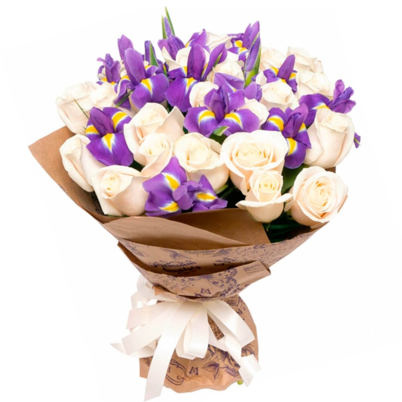 Букет состоит из 19 белых роз, 14 ирисов, крафт, атласная лента.