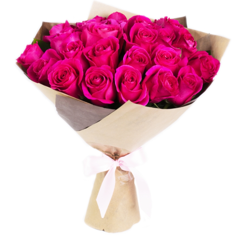 Букет состоит из 21 малиновая роза, крафт, атласная лента.
