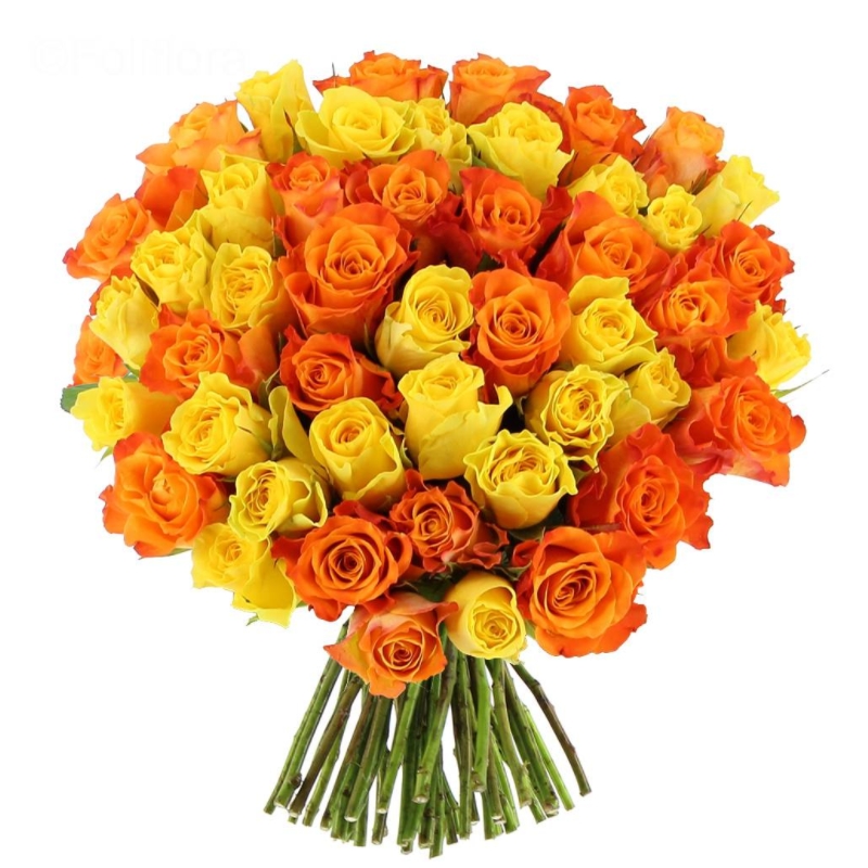 Букет состоит из 26 желтых роз, 25 оранжевых роз, прозрачная упаковка, атласная лента.